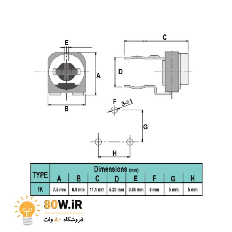 پتانسیومتر خوابیده پلاستیکی 1K (بسته 4 عددی)