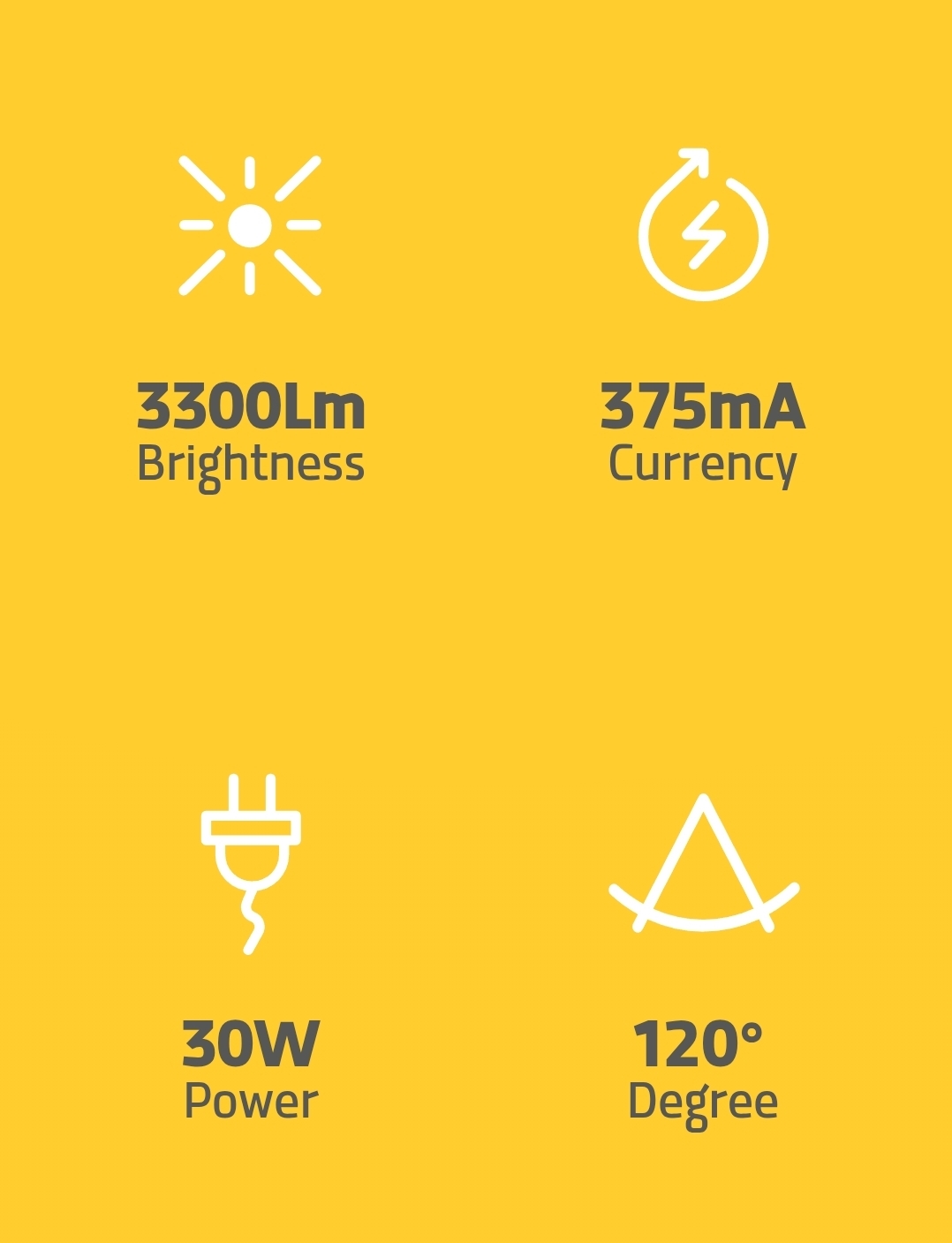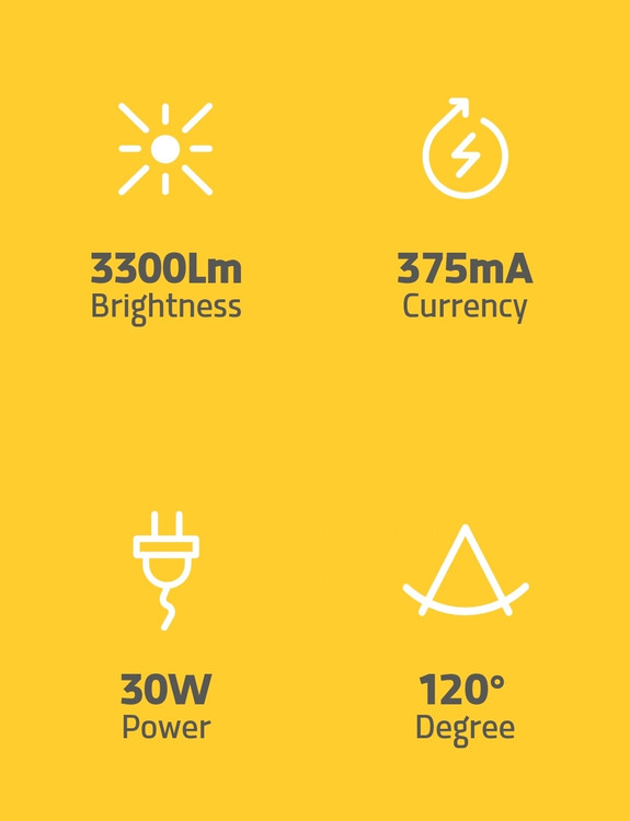 توان نامی 30W ولتاژ نامی 230V فرکانس نامی 50Hz جریان نامی 375mA شاخص نمود رنگ 80< رنگ نور آفتابی - مهتابی - صدفی Lx Fx L70 F50 @25°c ضریب توان 0.5< درجه حفاظت IP66 شارنوری 3300Lm مصرف انرژی 30KWh/1000h طول عمر 15000h