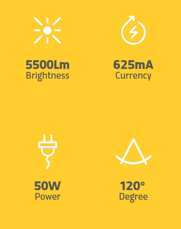 توان نامی 50W ولتاژ نامی 230V فرکانس نامی 50Hz جریان نامی 625mA شاخص نمود رنگ 80< رنگ نور آفتابی - مهتابی - صدفی Lx Fx L70 F50 @25°c ضریب توان 0.5< درجه حفاظت IP67 شارنوری 5500Lm مصرف انرژی 50KWh/1000h طول عمر 15000h