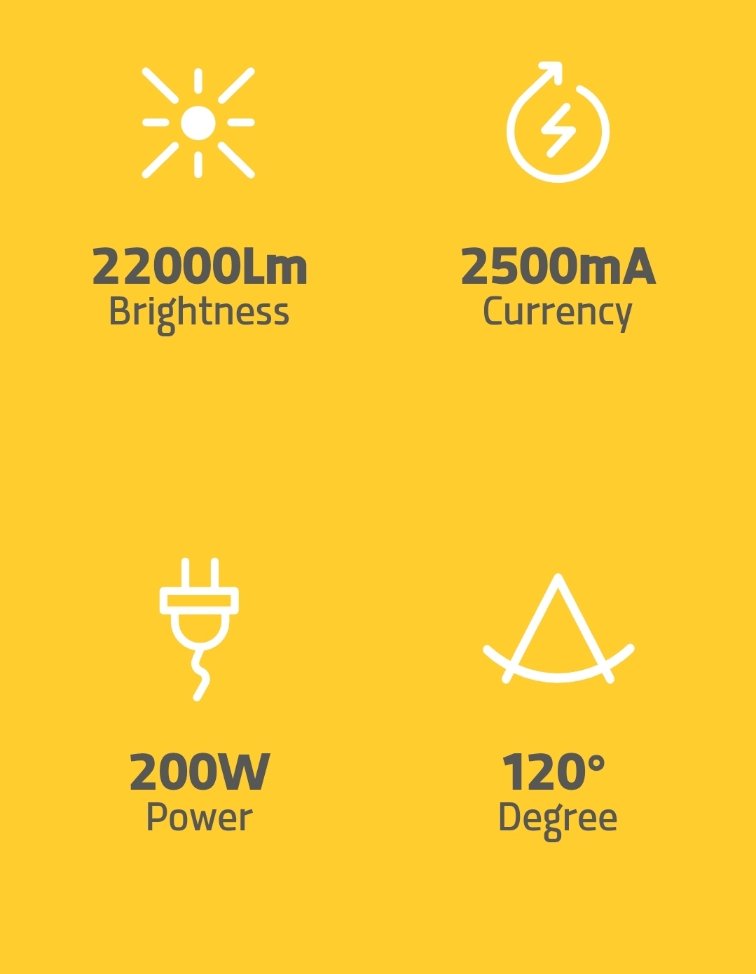 سایر مشخصات: توان نامی 200W ولتاژ نامی 230V فرکانس نامی 50Hz جریان نامی 2500mA شاخص نمود رنگ 80< رنگ نور آفتابی - مهتابی - صدفی Lx Fx L70 F50 @25°c ضریب توان 0.5< درجه حفاظت IP67 شارنوری 22000Lm مصرف انرژی 200KWh/1000h طول عمر 15000h