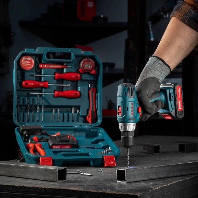 کیت دریل شارژی رونیکس مدل RS-8014 ساخت کشور چین کیت تجهیز شده به دریل شارژی رونیکس مدل 8014 مجهز به موتور پر قدرت با گشتاور 26 نیوتن متر دارای سه نظام اتوماتیک 10 میلی متر دو تکه فلزی باتری لیتیوم 14 ولت با ظرفیت 1.5 آمپر ساعت ساخت کره جنوبی حداکثر سرعت چرخش در حالت آزاد 400-0 و 1350-0 دور در دقیقه مجهز به گیربکس دو سرعته قدرتی و سرعتی جهت کارایی بهتر دارای سیستم چپ گرد و راست گرد چهت باز و بسته کردن انواع پیچ قابلیت چراغ LED برای کار در محیط تاریک یا کم نور قابلیت فست شارژ و دارای باتری 1/5 آمپر سامسونگ با عملکرد عالی تسلط حداکثری کاربر بر دستگاه و روند کار به واسطه دسته ضد لرزش دارای بدنه و دسته ی پلیمری مقاوم در برابر سقوط و ضربات احتمالی کلاچ 21 حالته برای بالا بردن دقت کار و افزایش طول عمر سه نظام دارای گیربکس دو سرعته با امکان انجام طیف وسیعی از کارها دارای ترکمتر قابل تنظیم 1+21 برای عملکرد بهتر به همراه 2 عدد باتری و 33 پارچه لوازم جانبی و متعلقات مورد نیاز لوازم جانبی شامل: متر، انبر دست، کاتر، سری پیچ گوشتی و سایر متعلقات دریل شارژی رونیکس با وزن مناسب 1.2 کیلوگرم دارای 12 ماه گارانتی رسمی شرکت رونیکس