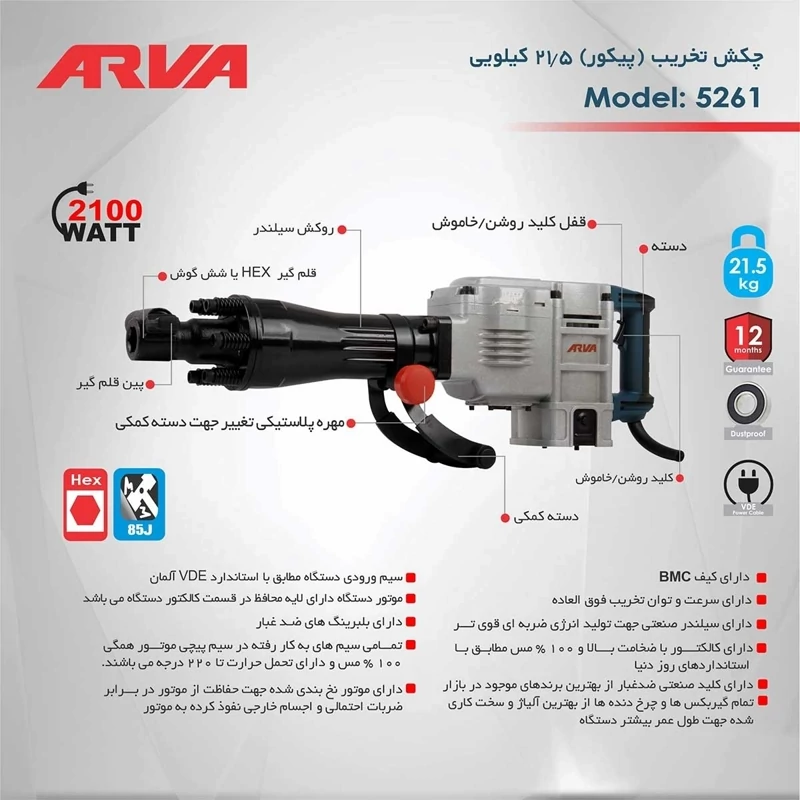لوازم جانبی: دو عدد قلم، یک جفت ذغال، دسته کمکی، آچار شش گوشه و آچار ولتاژ برق: 220 ولت فرکانس برق ورودی: 50 هرتز قدرت (توان) دستگاه: 2100 وات سرعت ضربه: 1650 bpm (ضربه بر دقیقه) قدرت ضربه: 85j سیستم قلم گیر: 6 گوش (HEX) قطعات اصلی: موتور، آرمیچر، گیربکس وزن: 21.5 کیلوگرم مدت گارانتی: 12 ماه کیف BMC: دارد دارای بلبرینگ ضد غبار ساخته شده از با کیفیت ترین متریال روز دنیا دارای سیلندر صنعتی جهت تولید انرژی ضربه ای قوی تر دارای کلیدهای صنعتی ضد غبار از بهترین برندهای موجود در بازار دارای کالکتور با ضخامت بالا و 100% مس مطابق با استانداردهای روز دنیا موتور دستگاه دارای چسب محافظ در قسمت کالکتور دستگاه دارای موتور نخ بندی شده جهت حفاظت از موتور در برابر ضربات احتمالی و اجسام خارجی تمام سیم های به کار رفته در سیم پیچی موتور همگی 100% مس و دارای تحمل حرارت تا 220 درجه تمام گیربکس ها و دنده ها از بهترین آلیاژ و سخت کاری شده جهت طول عمر بیشتر دستگاه پاسخگوی فعالیت های فوق صنعتی سخت و بسیار سنگین مشابه با برترین برندهای دنیا دارای طراحی ارگونومیک و دسته جانبی روکش شده با لاستیک ضد تعریق و ضد لرزش دارای سرعت و توان تخریب فوق العاده
