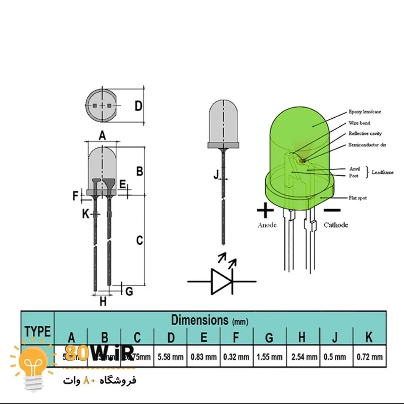 LED سبز 5mm مات پایه بلند (بسته 20 عددی)