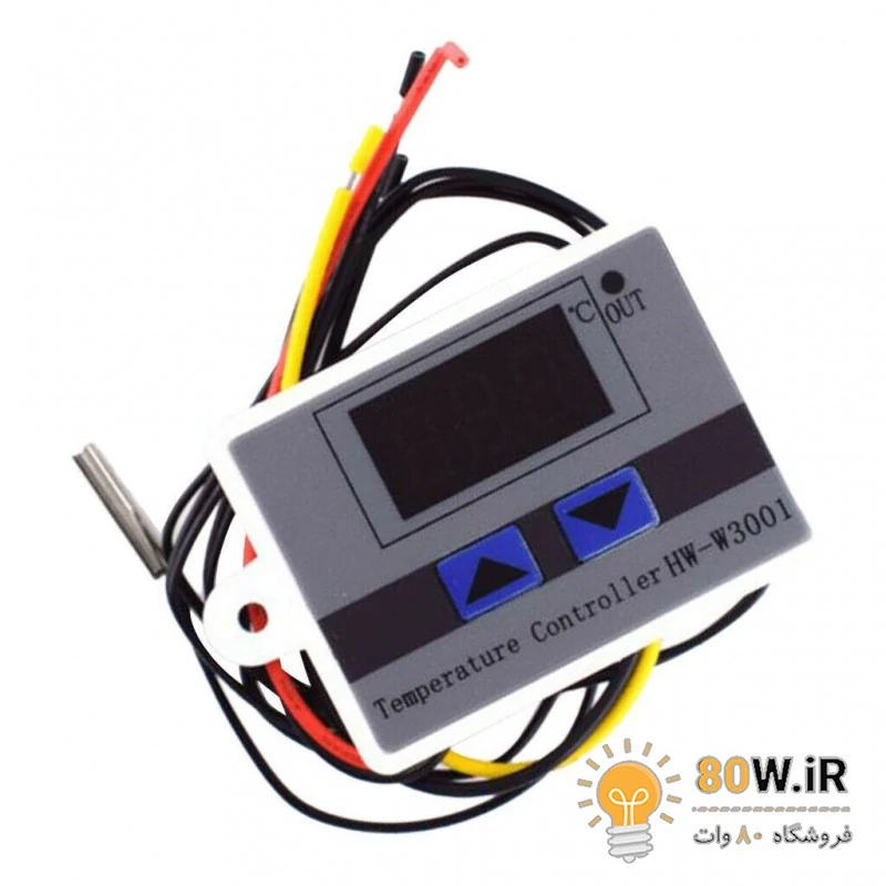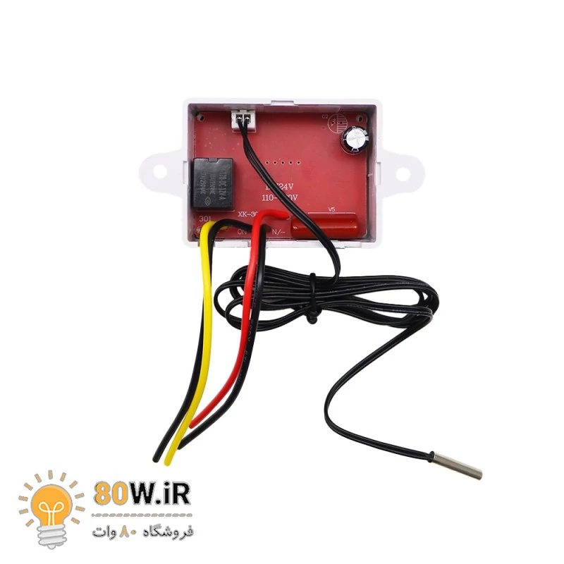 ماژول ترموستات XH-W3001 مدل ۲۲۰ ولت با محدوده دمایی -50 تا 110 درجه سانتی گراد مشخصات ولتاژ کاری ۲۲۰ ولت دقت اندازه گیری ۰٫۱ درجه اندازه گیری دما در بازه ۵۰- الی ۱۱۰ درجه سانتی گراد قابلیت کارکردن در دو مد گرمایش و سرمایشی تنظیم ماژول XH-W3001 در مد گرمایشی و سرمایشی : برای کار در مد گرمایشی می بایست با فشردن دکمه Up دمایی که میخواهید در آن دما هیتر راه اندازی شود را وارد کنید مثلا دمای ۲۳ درجه ، حال با فشردن دکمه Down دارد می توانید مشخص نمایید که هیتر در چه دمایی قطع شود مثلا در ۳۰ درجه ، حال چنانچه دما محیط به ۲۳ درجه سانتی گراد برسد هیتر متصل شده به خروجی ماژول روشن شده و باعث می شود تا دمای محیط افزایش یابد. با رسیدن دمای محیط به مقدار تعیین شده (۳۰ درجه) هیتر خاموش می شود.این فرایند بطور دائم با تغییر دما ادامه پیدا می کند. برای کار در مد سرمایشی چنانچه تنظیمات انجام گرفته برای مد گرمایشی را بلعکس نمایید می توانید از ماژول در مد سرمایشی استفاده کنید. یعنی با فشردن دکمه Up دما ۳۰ درجه را تنظیم نمایید. و با فشردن دکمه Down دما ۲۳ درجه را تنظیم نمایید.حال چنانچه دمای محیط آن قدر گرم شود که به دما ۳۰ درجه برسد دستگاه کولر متصل شده به خروجی ترموستات روشن شده و سعی می کند دمای محیط را خنک کند. با روشن شدن کولر و سرد شدن محیط ، کولر در دمای ۲۳ درجه تنظیم شده خاموش می شود.واین سیکل با تغییر دما ادامه پیدا می کند تا دما در یک بازه خاص حفظ شود.